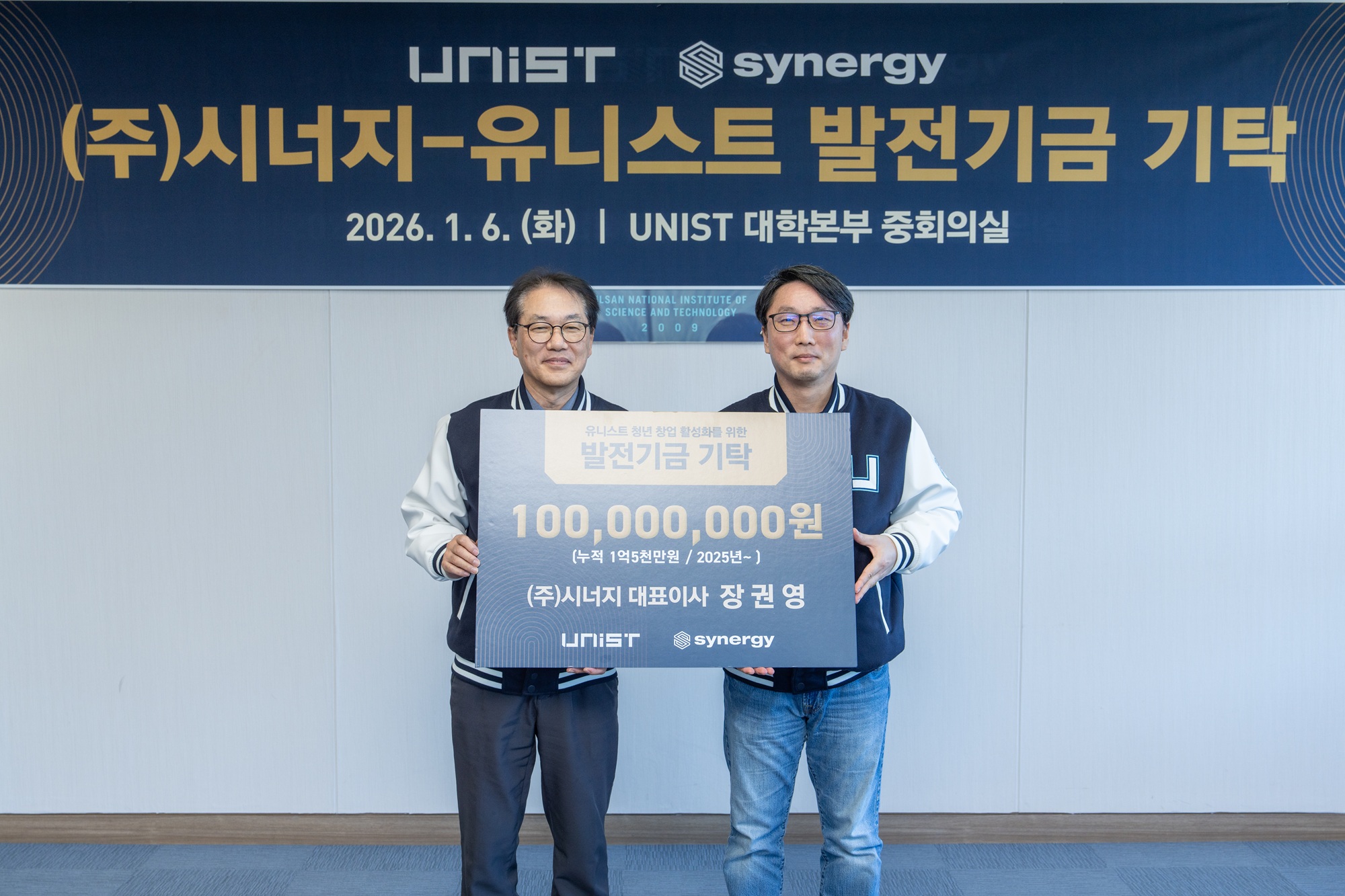 장권영 ㈜시너지 대표는 “지난해 기부를 통해 UNIST가 보유한 혁신 기술과 창업 인프라의 강력한 잠재력을 다시 한번 확인했다”며 “울산에 뿌리를 둔 기업으로서 지역 인재의 아이디어가 사업화로 연결되는 ‘창업 선순환 구조’를 만드는 데 일조하고 싶다”고 밝혔다. 그는 “신재생에너지 분야의 기술력을 바탕으로 UNIST와 긴밀히 협력해 지역 산업의 경쟁력을 높이고 신산업으로 전환하는 데 기여하겠다”고 덧붙였다.